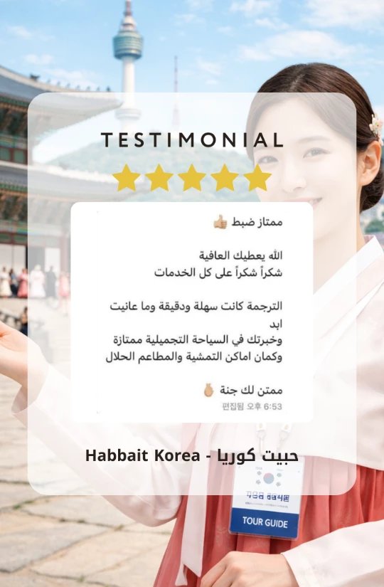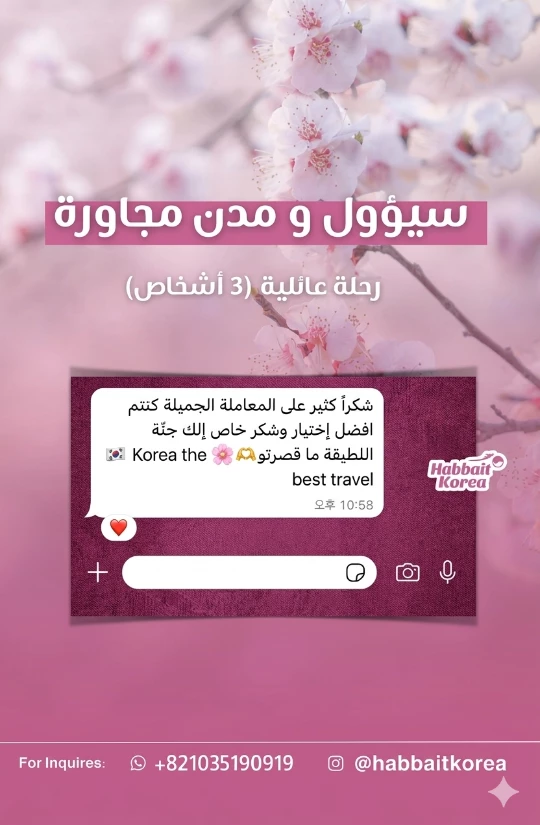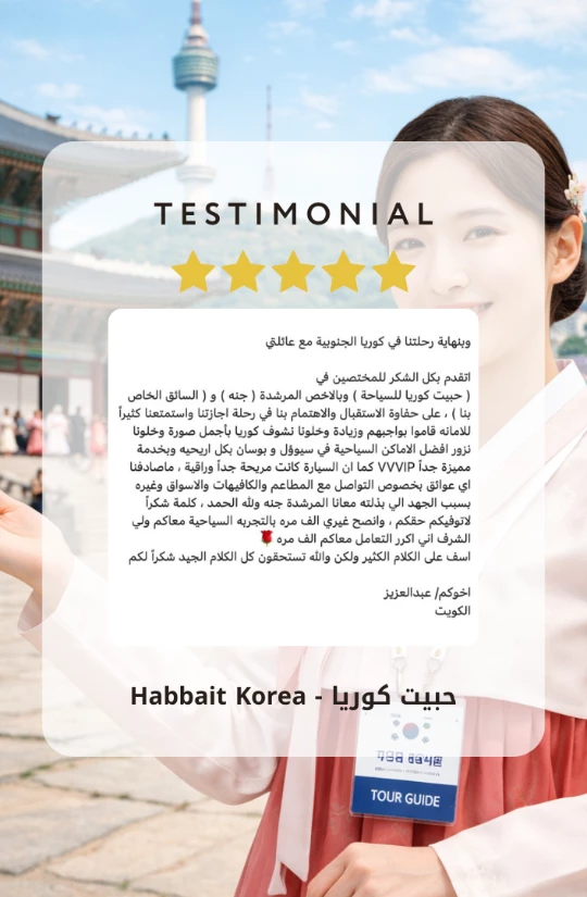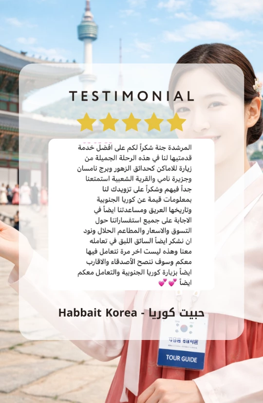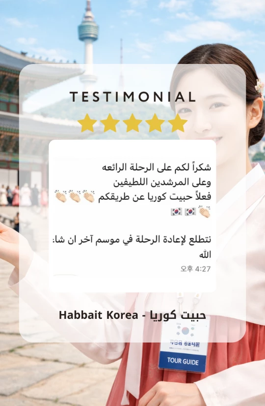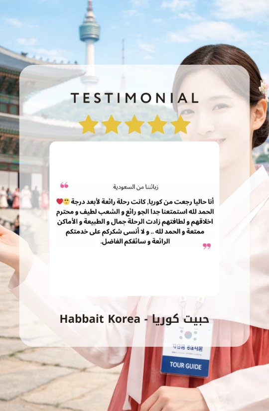 استمتع برحلة مدتها 7 أيام تجمع بين الحداثة والتقاليد في سيؤول وجيونجي. برنامج متكامل يشمل سيارة خاصة، مرشد عربي، وتذاكر لأشهر المعالم، مع جدول مريح يناسب كل الأعمار والاهتمامات. عيش تجربة كوري...