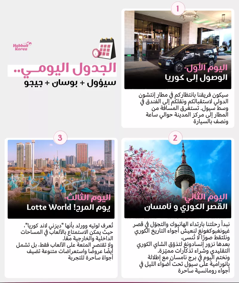 "الأطفال انبهروا بمدينة ألعاب لوتيه وورلد في سيؤول. زيارة القرية الشعبية ومكتبة ستارفيلد كانت مسك الختام للرحلة. السيارة الخاصة وفرت علينا الكثير من التعب والجهد، خاصة مع العائلة. أنصح بهذا البرنامج بشدة."