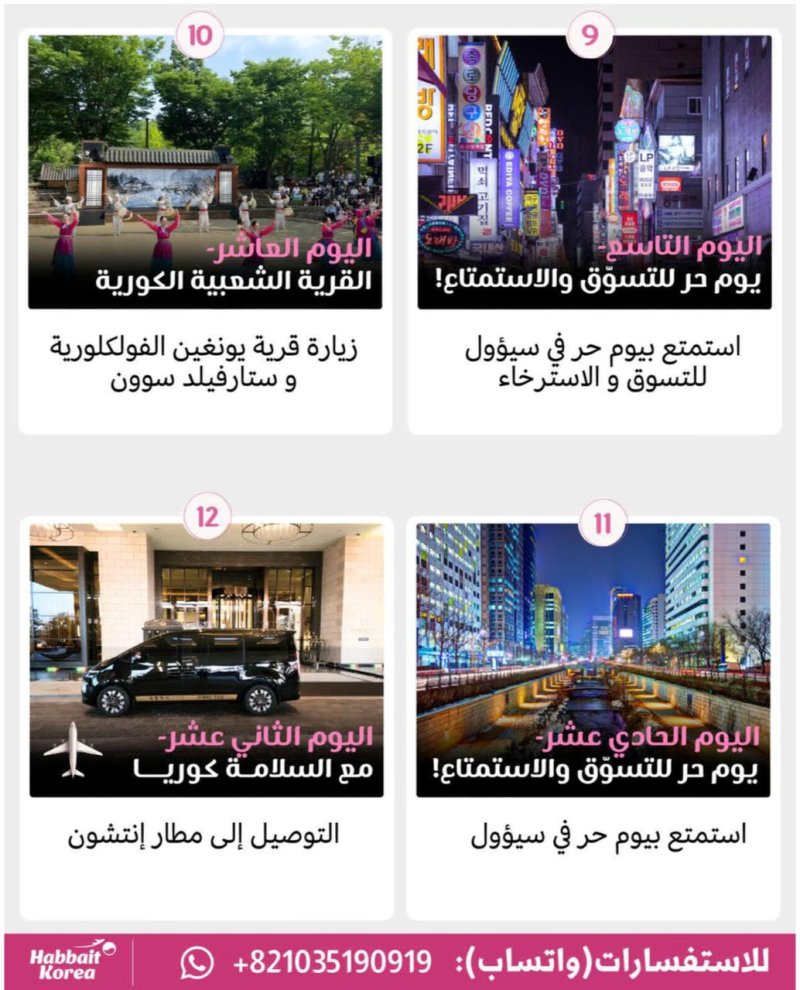 - اليوم 9-10: العودة لسيؤول، وزيارة القرية الشعبية الكورية ومكتبة ستارفيلد الشهيرة.